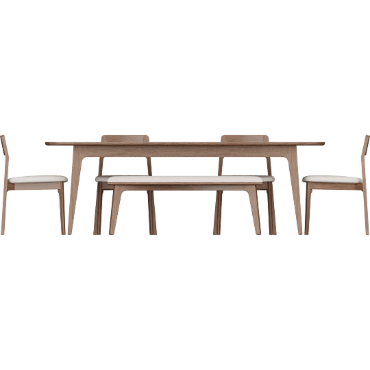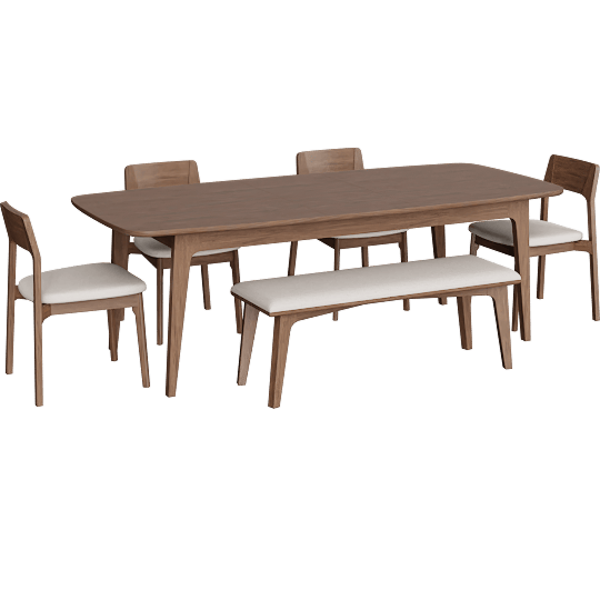 Casey Walnut Wood Self Storing Butterfly Leaf Extendable 72-90 Rectangular Dining Table With 4 Upholstered Side Chairs And Upholstered Bench