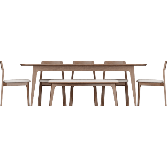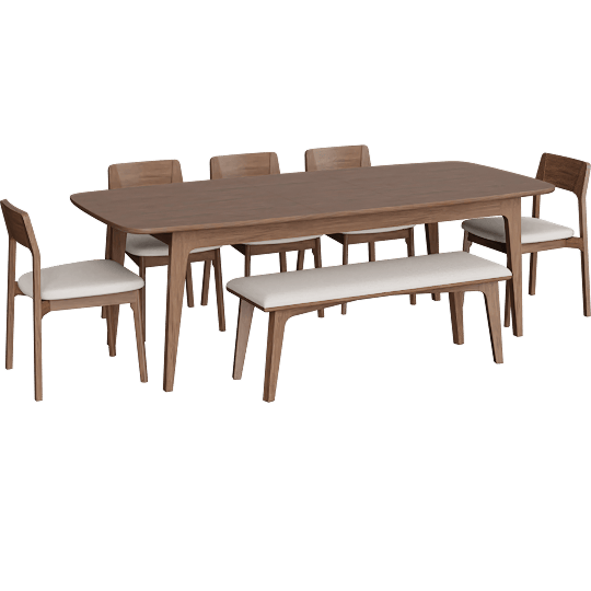 Casey Walnut Wood Self Storing Butterfly Leaf Extendable 72-90 Rectangular Dining Table With 5 Upholstered Chairs And Upholstered Bench